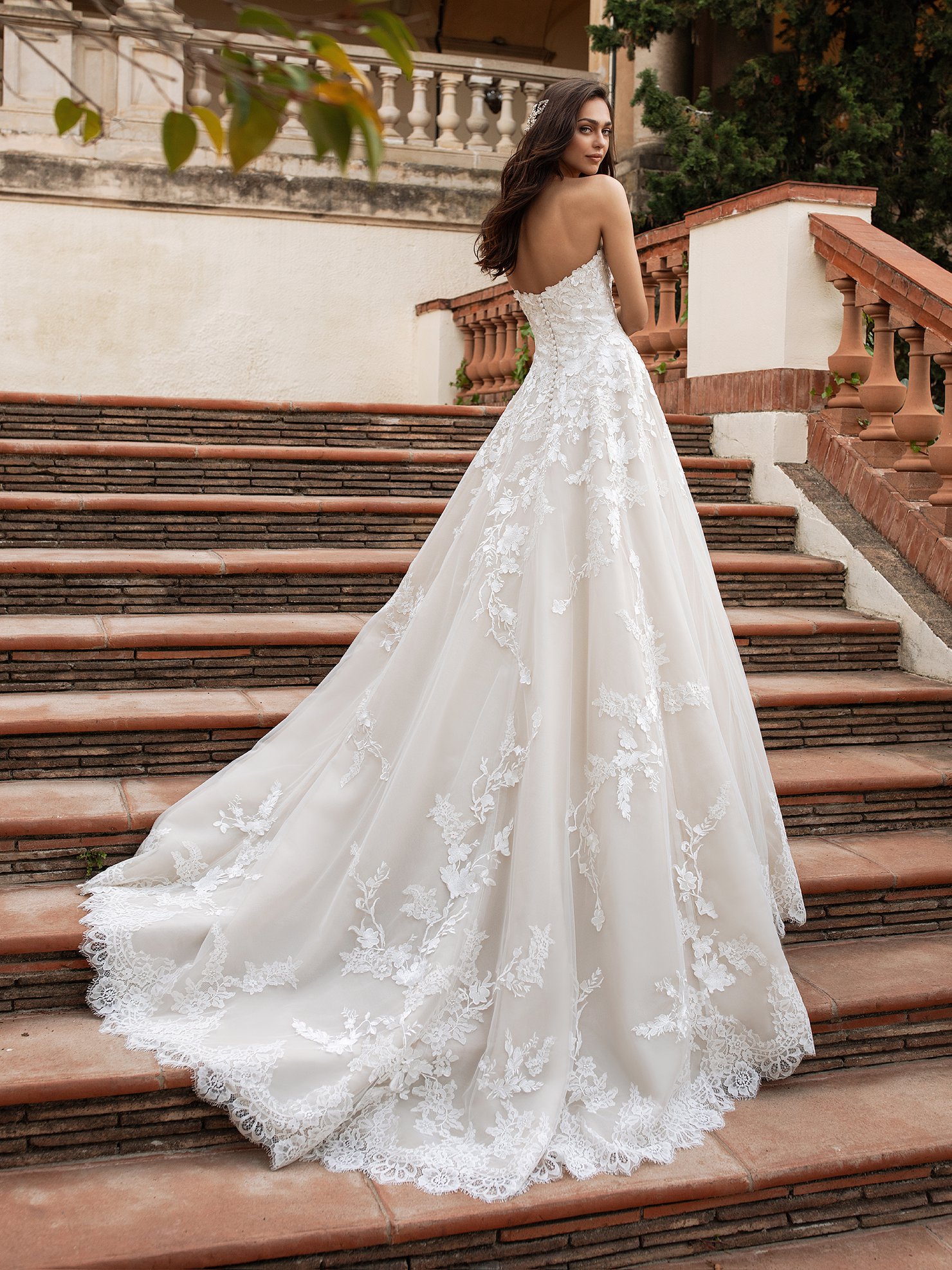 Celý model je bohato zdobený jemnou francúzskou čipkou, ktorá pokrýva nielen top, ale aj rozširujúcu sa sukňu, čím vytvára nádherný a luxusný vizuálny dojem. Spodná časť sukne a dlhá vlečka sú zakončené čipkovou bordúrou, ktorá dodáva šatám romantický a detailne prepracovaný finiš.