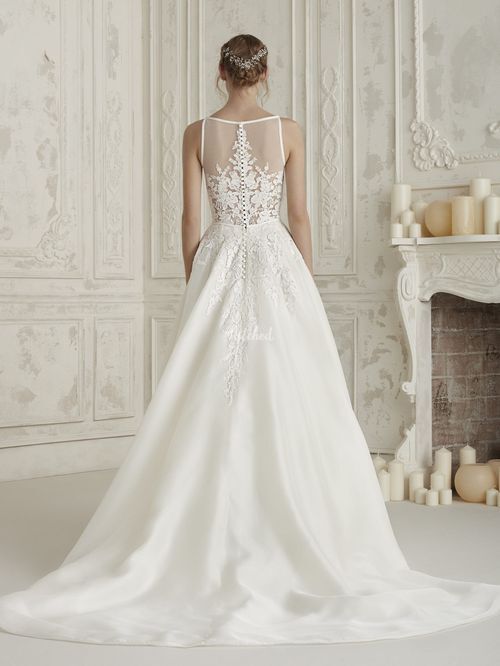Sukňa je z ľahučkej organzy, pôsobí vzdušne, padavo a sofistikovane, pričom zachováva slávnostný charakter svadobných šiat. Šaty sú doplnené o dlhú vlečku, ktorá sa dá prakticky vypnúť, čo zaručuje pohodlie aj počas večerného programu.