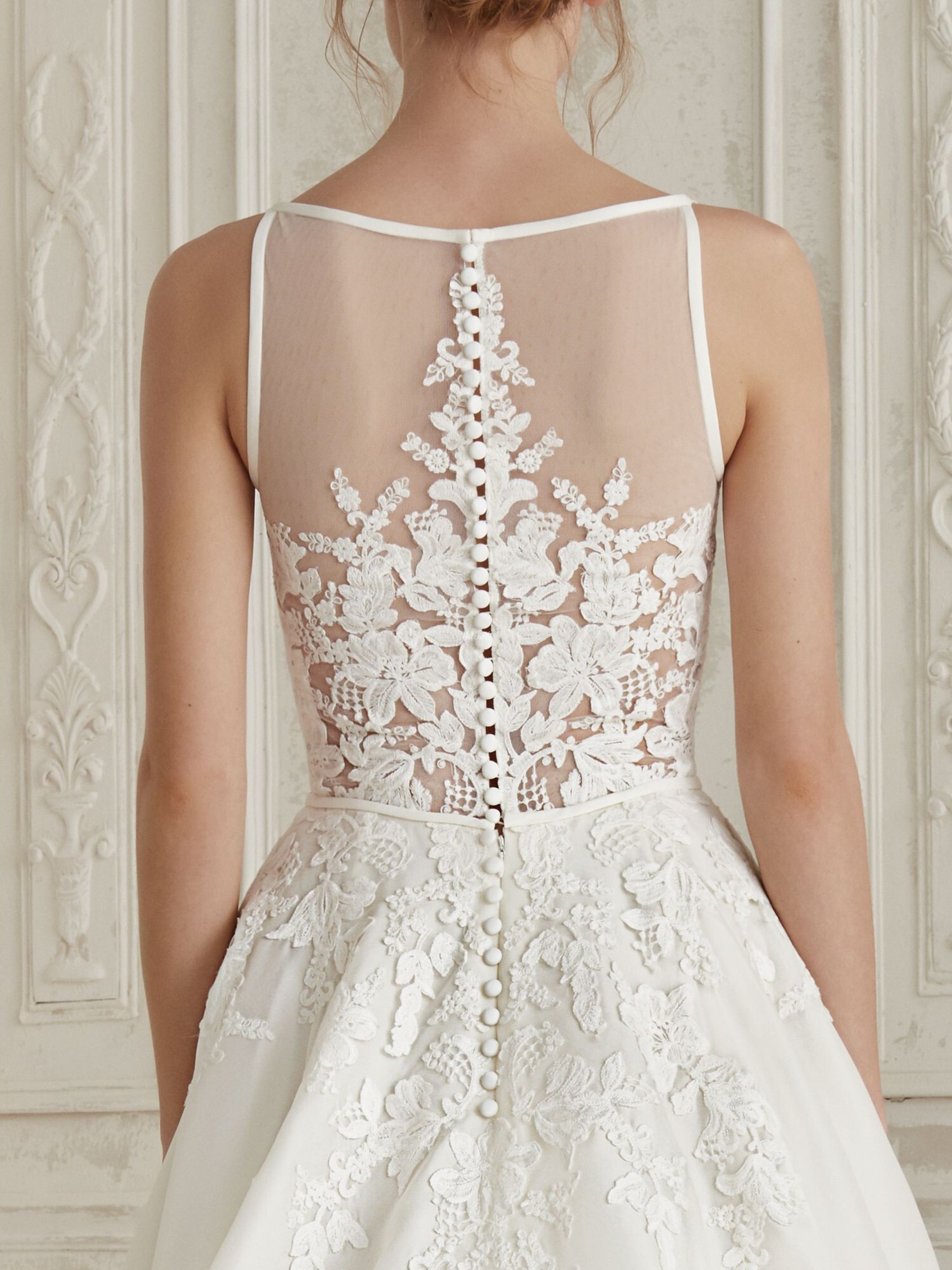 Chrbát šiat je celý pokrytý transparentnou čipkovou aplikáciou, ktorá pôsobí veľmi jemne a elegantne, pričom dodáva šatám pôsobivý detail z každého uhla.