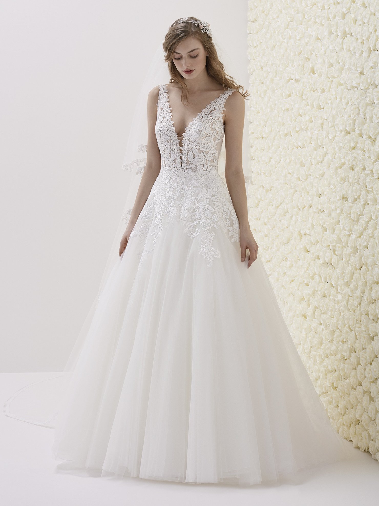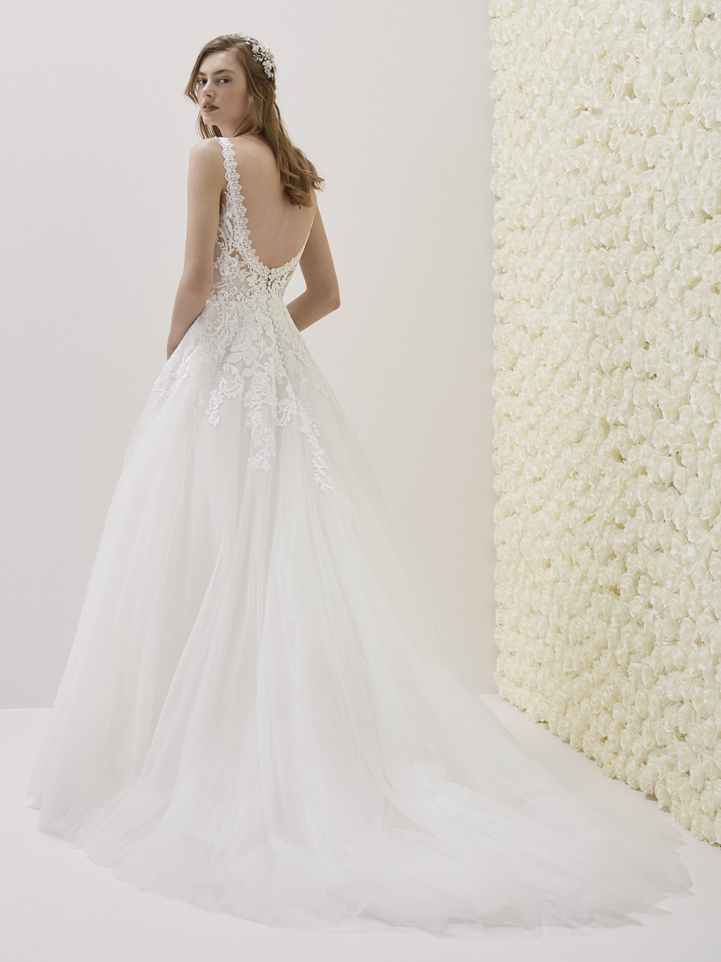 Model dopĺňa dlhá vlečka, ktorá sa dá prakticky vypnúť, takže nevesta môže pohodlne tancovať a pohybovať sa bez obmedzenia. Estibaliz je dostupný aj vo väčších veľkostiach, aby sa každá žena mohla cítiť výnimočne.