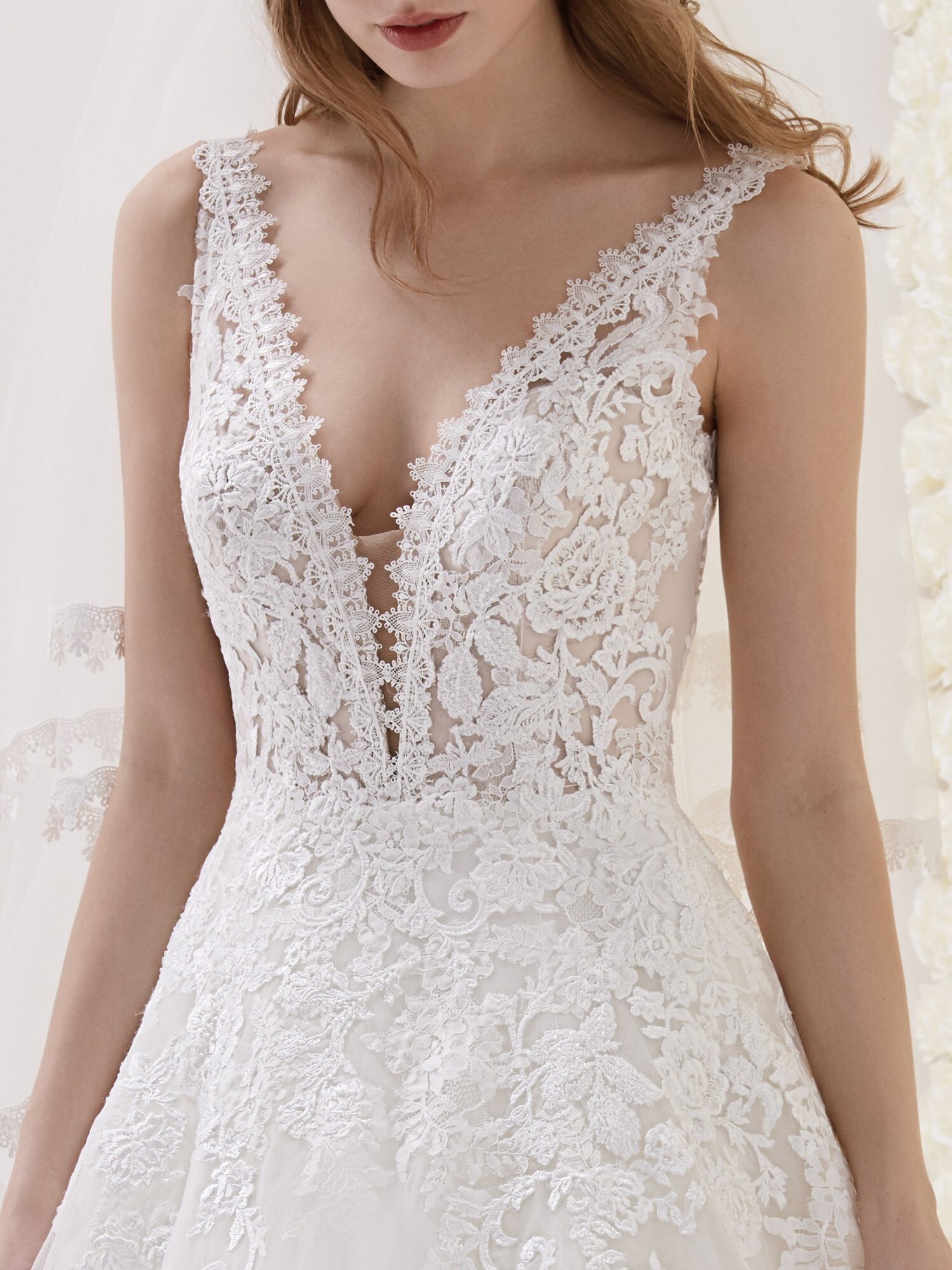 Model Estibaliz z dielne Pronovias je ako stvorený pre nevestu, ktorá túži po jemnom, romantickom vzhľade s bohémskym nádychom. Vrchná časť šiat tvorí čipkový top s ostrým V-výstrihom, ktorý krásne predlžuje líniu krku a zároveň zvýrazňuje dekolt. Výstrih je lemovaný nádhernou paličkovou krajkou, ktorá pridáva celému modelu remeselnú jemnosť a vintage nádych.