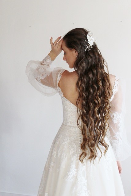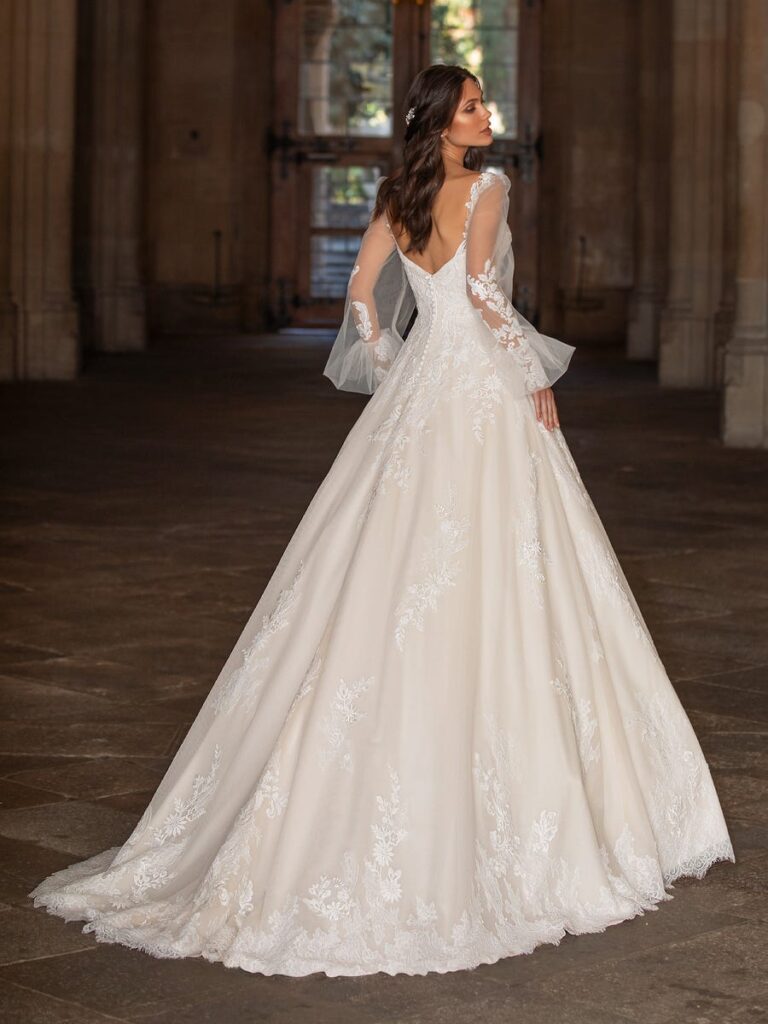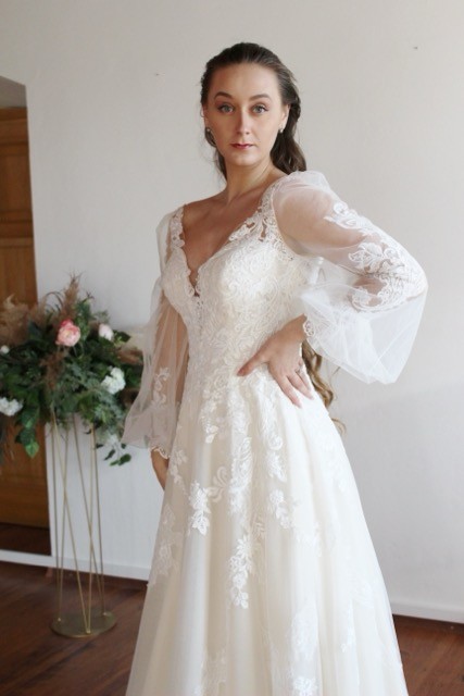 Dlhé rukávy sú jemne voľné a vzdušné, zakončené čipkovým zdobením, ktoré dodáva ľahkosť a zároveň ladí so zvyškom šiat. Sukňa sa smerom nadol rozširuje a jej zakončenie tvorí čipková bordúra, ktorá sa opakuje aj na nádhernej dlhej vlečke – tú je možné vypnúť, čo ocení nevesta pri večernom tanci.