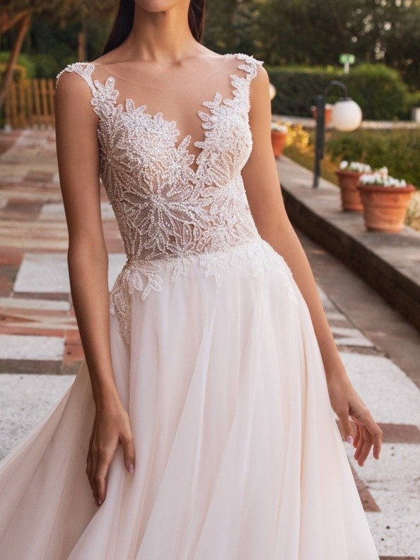 Io sú romantické boho svadobné šaty s perličkovou výšivkou, transparentným tylovým chrbtom a ľahkou vrstvenou tylovou sukňou.