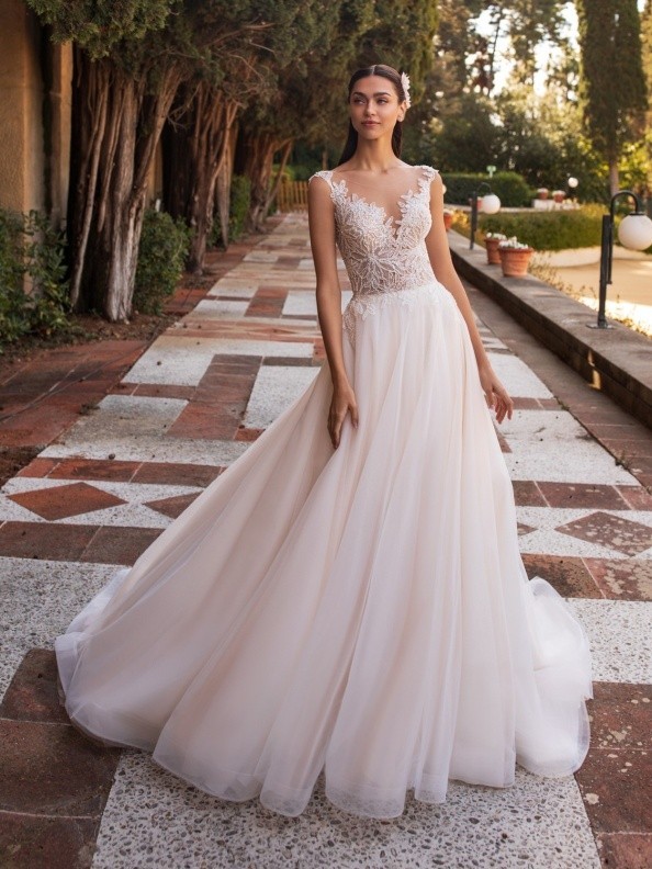 Sukňa je z viacerých vrstiev tylu, vďaka čomu je ľahká, vzdušná a padavá, pričom si zachováva jemnú boho siluetu. Šaty dopĺňa dlhá vlečka, ktorá dodáva slávnostný rozmer a dá sa vypnúť pre pohodlie počas oslavy. Model Io je dostupný aj vo väčších veľkostiach, takže si ho môžu dopriať nevesty všetkých konfekčných veľkostí.
