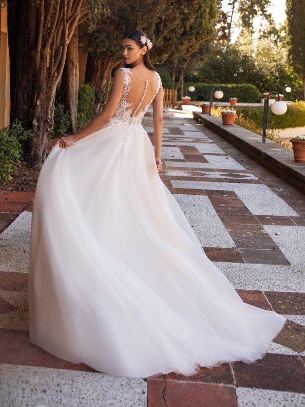 Chrbát je zahaľený jemným transparentným tylom, cez ktorý vedie rad hladkých gombíkov – tento detail pôsobí veľmi elegantne, zároveň však zostáva vzdušný a nežný.