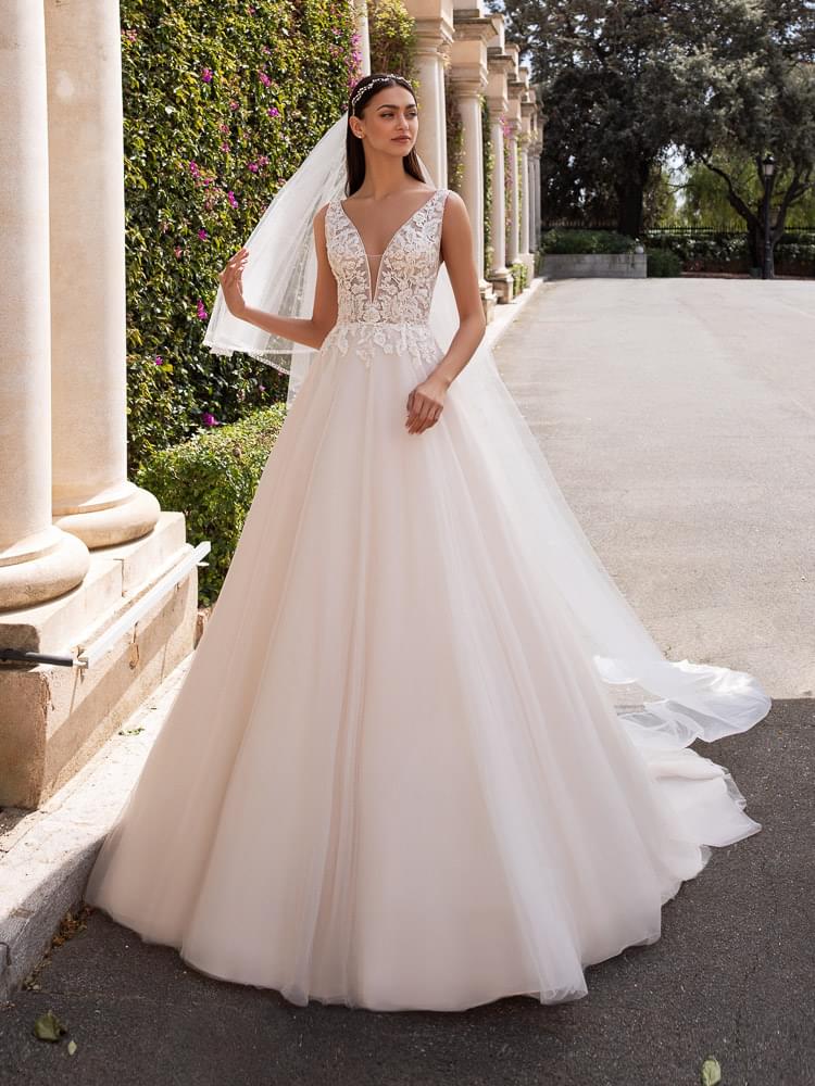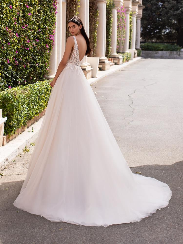 Sukňa z niekoľkých vrstiev jemného tylu pôsobí maximálne vzdušne a ľahko, čo dodáva šatám pohyb a éterickosť. Dlhá vlečka šatám dodáva svadobný rozmer, no je prakticky vypínateľná, čo ocení každá nevesta počas večerného programu. Model je navyše dostupný aj vo väčších veľkostiach, takže si ho môže dopriať každá žena bez kompromisov.