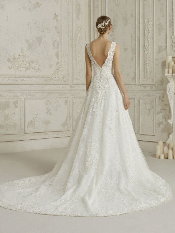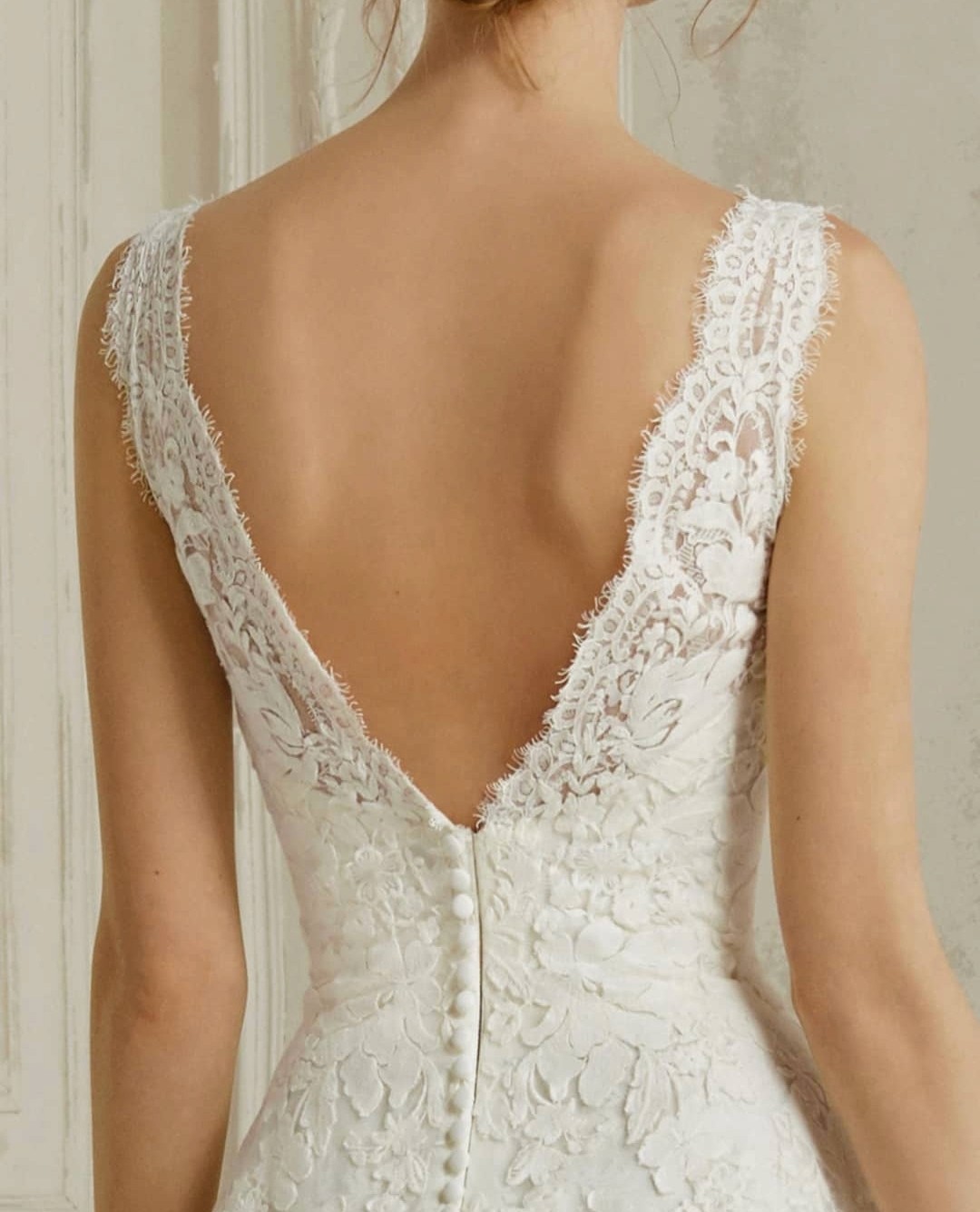 Dekolt má ostrý, hlbší výstrih, ktorý však zostáva vkusný a elegantný, a preto krásne zvýrazní hornú časť postavy bez zbytočnej vyzývavosti. Chrbát šiat je odhalený, čo dodáva modelu jemnú zmyselnosť, stále však v súlade s romantickým dojmom.