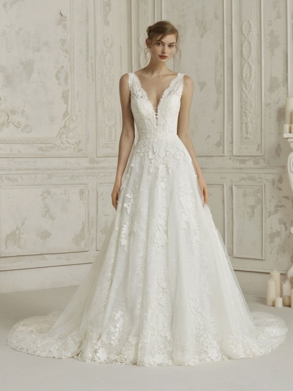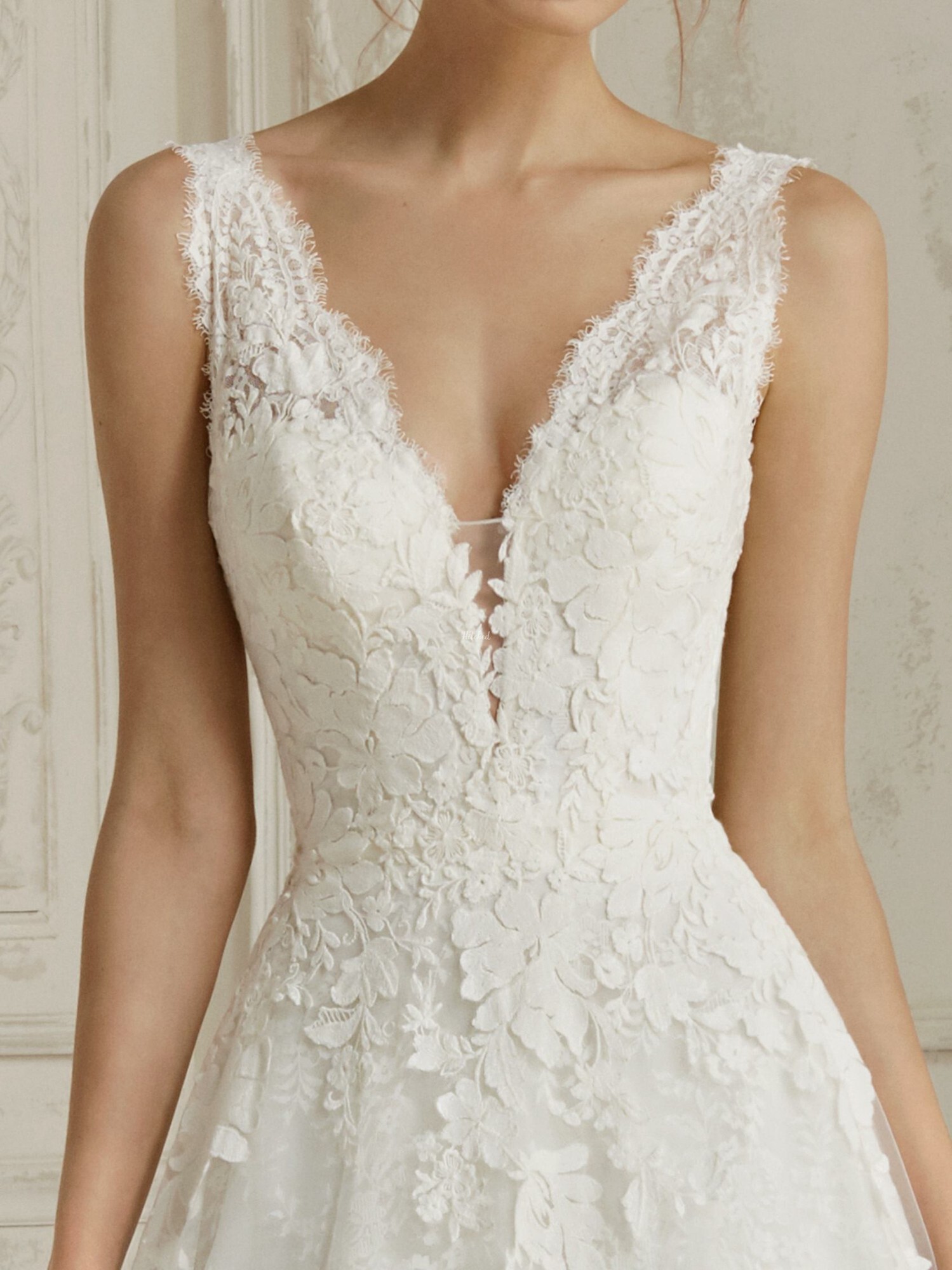 Model Maggie z dielne Pronovias je ideálnou voľbou pre nevestu, ktorá túži po čistej romantike s nežným a elegantným nádychom. Celý model je vypracovaný z nádhernej francúzskej čipky, ktorá mu dodáva luxusný a detailne spracovaný vzhľad.