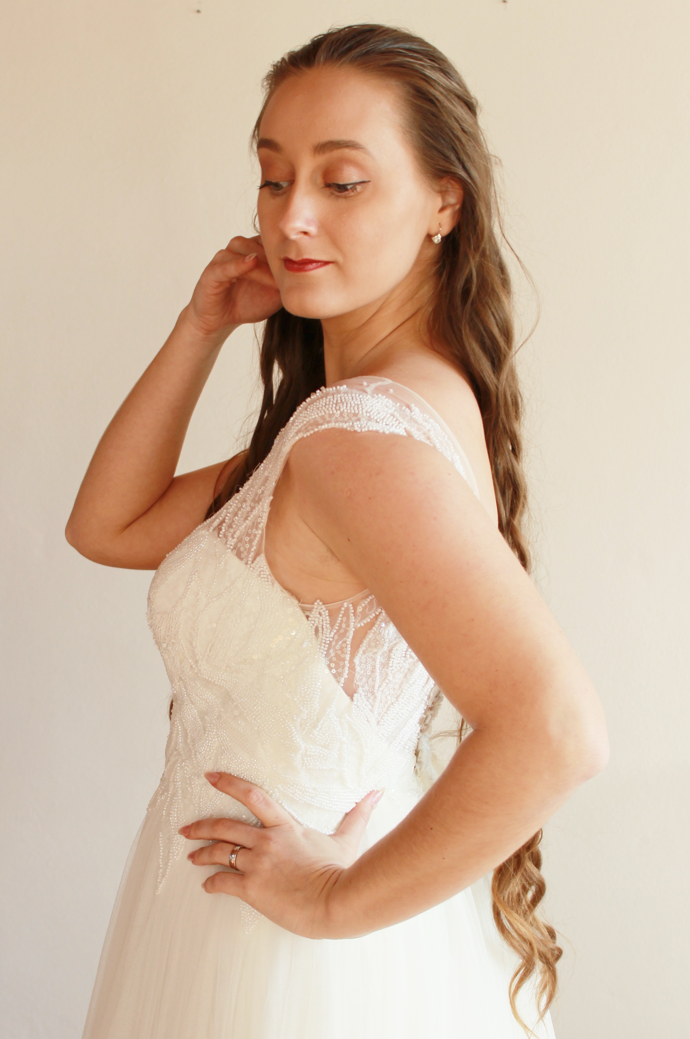 Sukňa je z niekoľkých vrstiev jemného tylu, vďaka čomu je padavá, vzdušná a veľmi ľahučká. Tento strih šiat sa v pohybe krásne vlní a pôsobí étericky. Nechýba ani dlhá vlečka, ktorá šatám dodáva slávnostný a svadobný šmrnc – s možnosťou vypnutia, pre pohodlný pohyb počas večera.