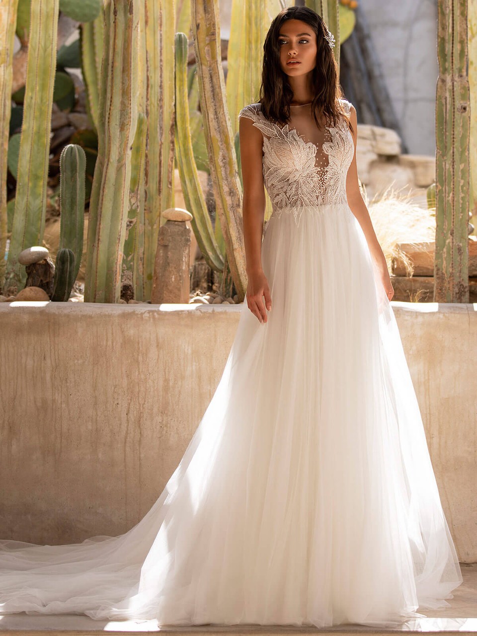 Mirren sú romantické boho svadobné šaty s perličkovou čipkou, véčkovým výstrihom a ľahkou tylovou sukňou s vlečkou.
