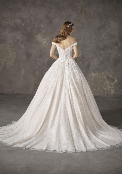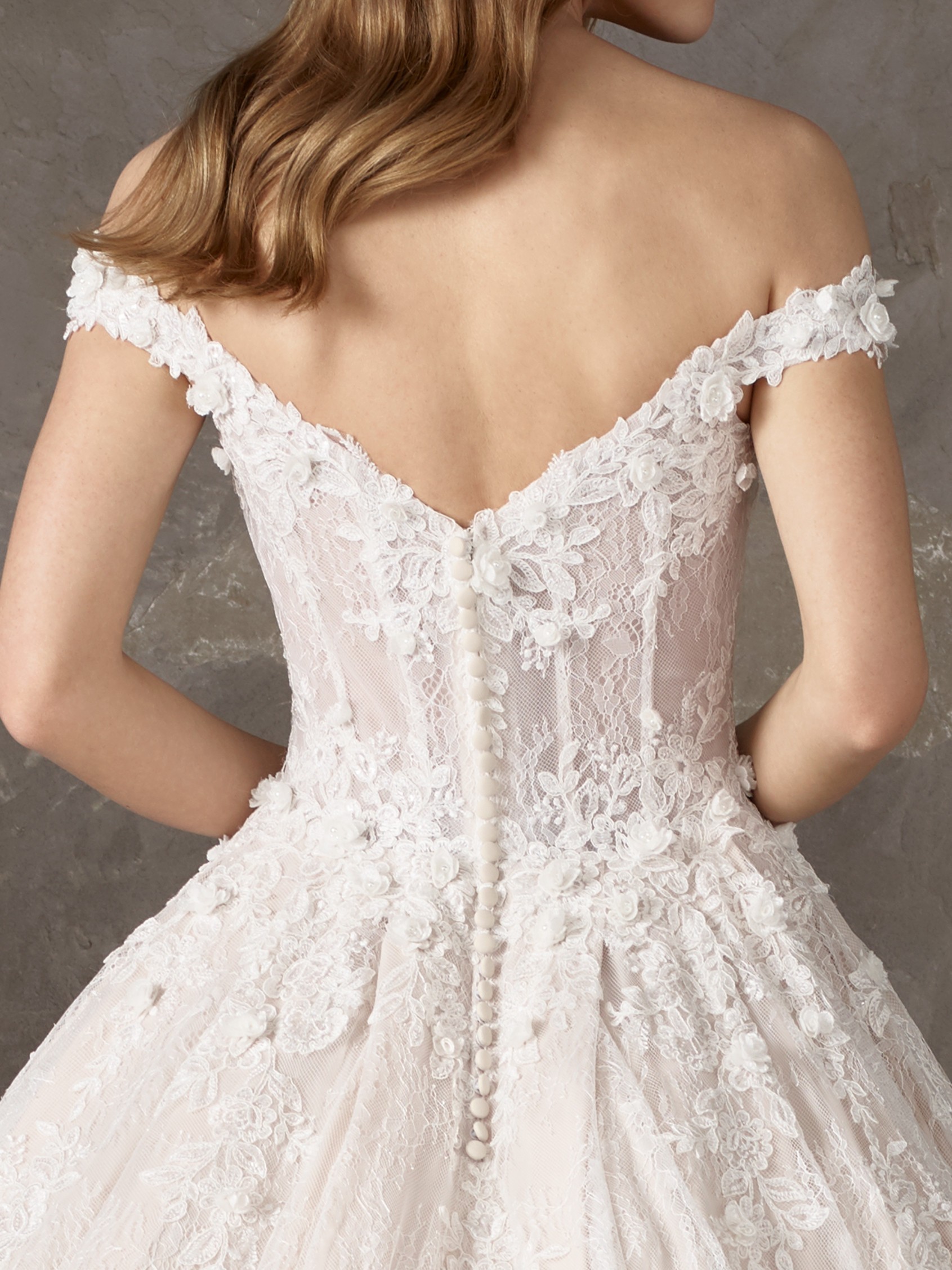 Model Namibia z dielne Pronovias je navrhnutý pre nevestu, ktorá túži vyzerať ako z rozprávky – romanticky, elegantne a zároveň veľkolepo. Šaty sú celé ušité z jemnej a luxusnej francúzskej čipky, ktorá pôsobí bohato, no vďaka precíznemu spracovaniu nepôsobí ťažko.