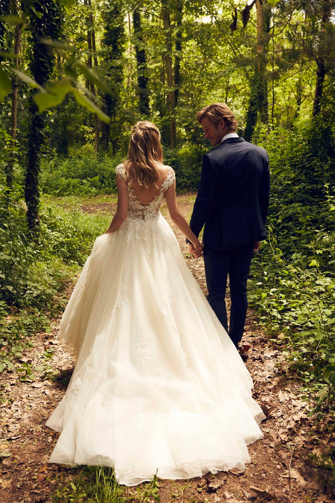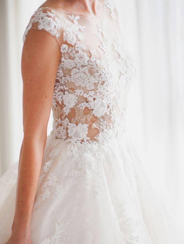 Vrchná časť šiat je celá priehľadná, zdobená čipkovými aplikáciami, ktoré vytvárajú ilúziu jemného zahalenia a zároveň pôsobia veľmi nežne a ženským spôsobom zvýrazňujú siluetu. Chrbát je odhalený, no stále jemný a vkusný – presne taký, aký si romantická nevesta predstavuje.