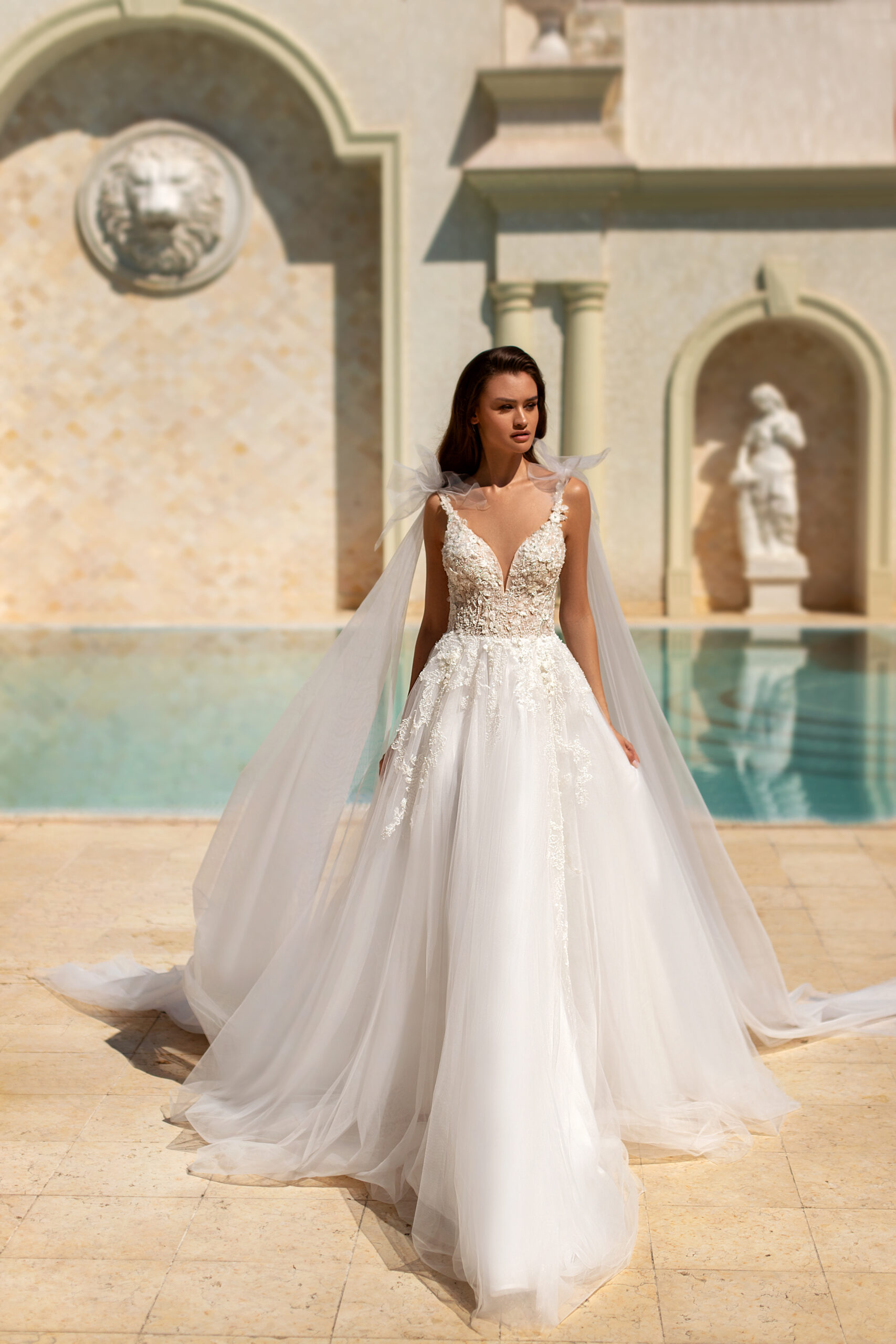 Ofelis sú veľmi romantické svadobné šaty s čipkovaným topom, vystúpenými kvetinkami, odhaleným chrbtom a tylovou sukňou s možnosťou tylových mašlí.