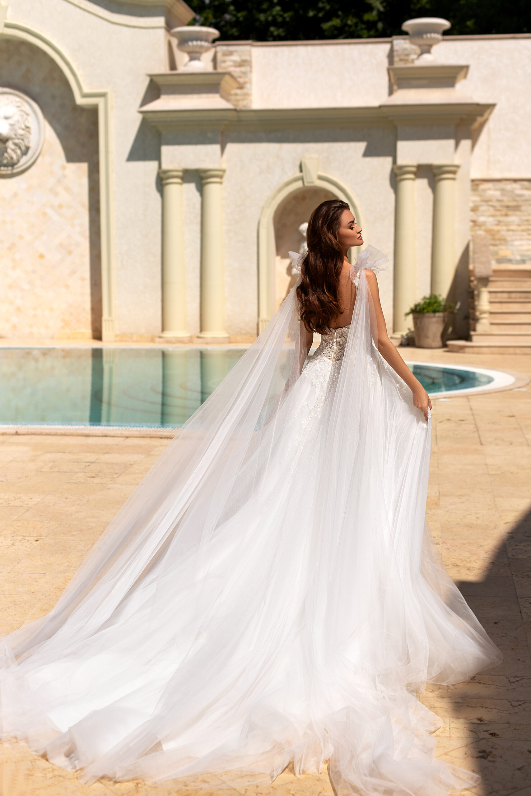 Odhalený chrbát pôsobí zmyselne, no vďaka romantickým detailom si šaty zachovávajú jemný a éterický dojem. Sukňa z viacerých vrstiev tylu je ľahučká a krásne splýva, čím podčiarkuje snovú siluetu. Nechýba ani dlhá vlečka, ktorá sa dá vypnúť, aby nevesta mohla bez obmedzení tancovať a pohybovať sa počas oslavy.