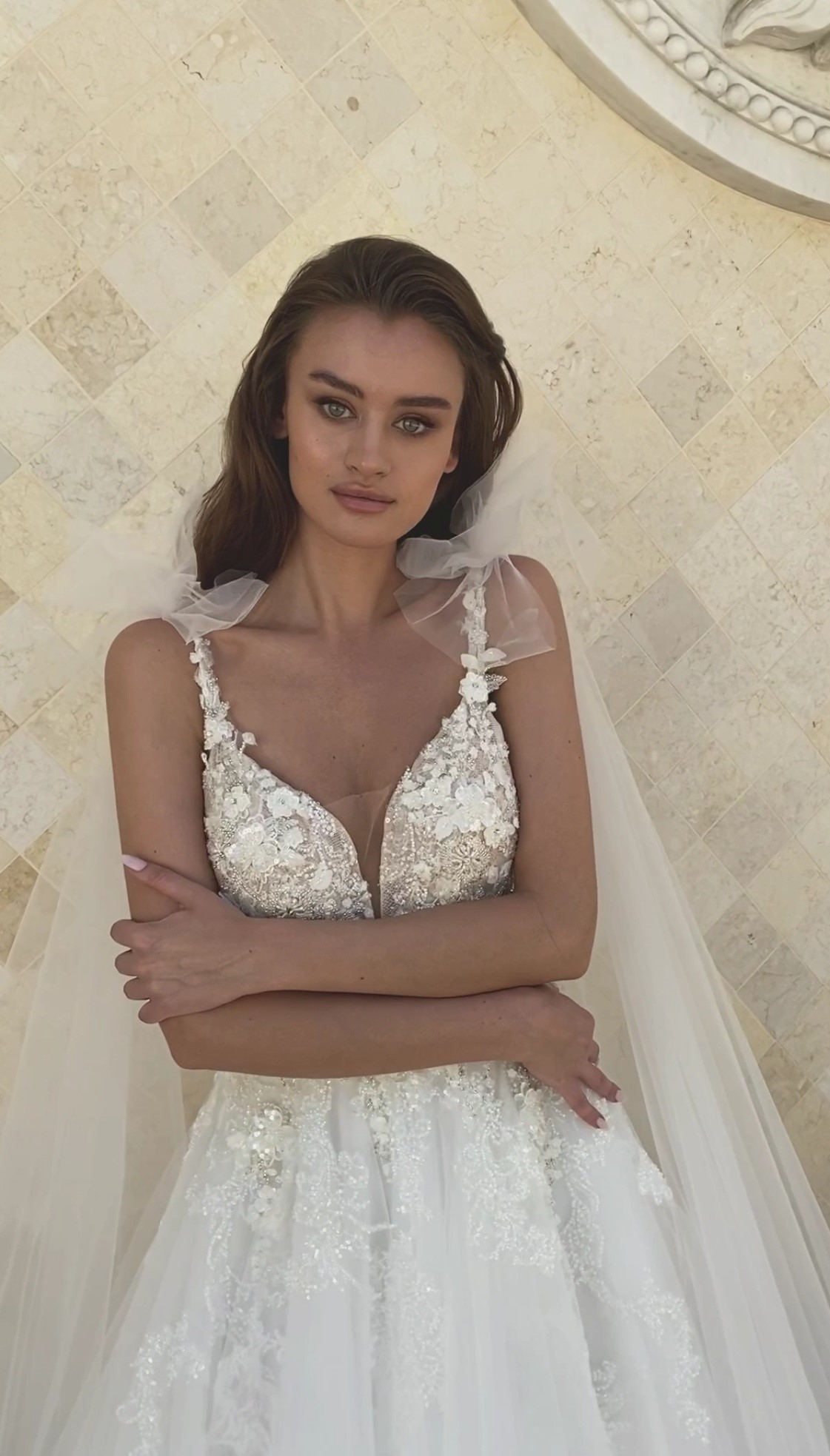 Model Ofelis z dielne Giovanna Alessandro je nežný, éterický a stvorený pre nevestu, ktorá chce pôsobiť výnimočne romanticky. Vrchná časť šiat je čipkovaná a bohato zdobená vystúpenými kvetinkami, ktoré pridávajú modelu hĺbku a rozprávkový šarm. Hlboký V-výstrih na tenkých ramienkach krásne zvýrazňuje dekolt, a zároveň zachováva jemnosť celkového vzhľadu.